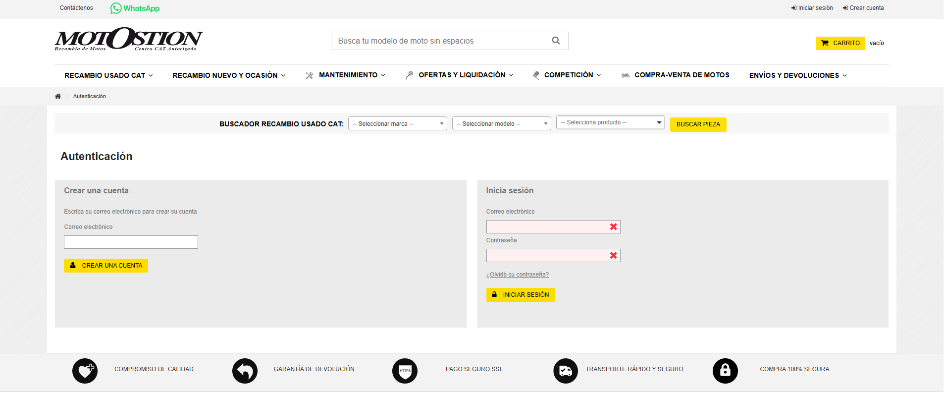 - Para hacer el pedido has tenido que registrarte en MotOstion, por lo que ahora solo es necesario iniciar sesión con el correo que has utilizado, si no recuerdas la contraseña haz click en "¿Olvidó su contraseña?" situado encima del botón "INICIAR SESIÓN".