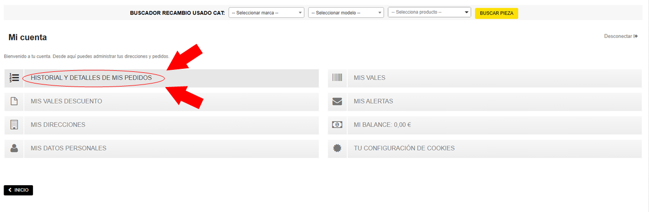 - Para ver todos tus pedidos realizados, haz click en "HISTORIAL Y DETALLES DE MIS PEDIDOS"